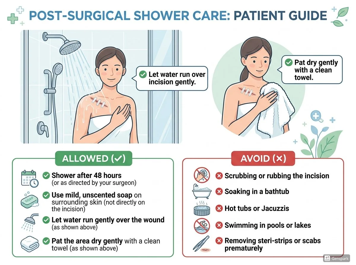 Do NOT soak in a tub, hot tub, or pool until cleared (usually 4–6 weeks).